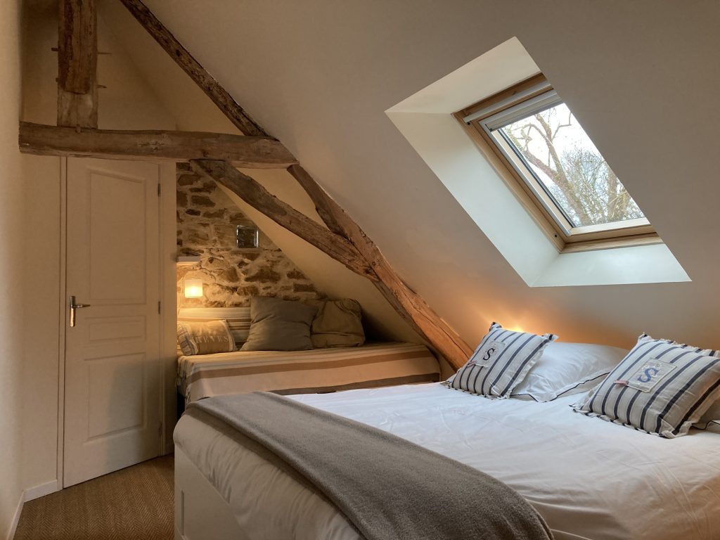 La chambre est à l’étage (accès par échelle de meunier – déconseillé aux jeunes enfants et personnes âgées) avec un lit de 160cm. Nombreux rangements.